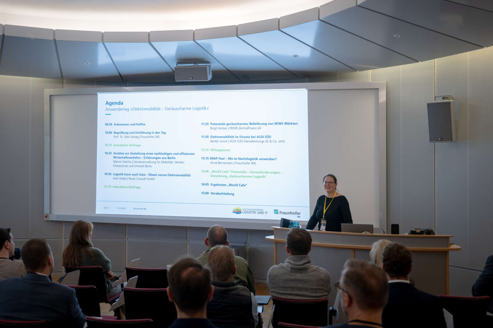 After the welcoming address by Prof. Dr. Alex Vastag, Head of Transport Logistics at Fraunhofer IML, the program offered practical insights into current strategies and technologies for low-noise logistics: